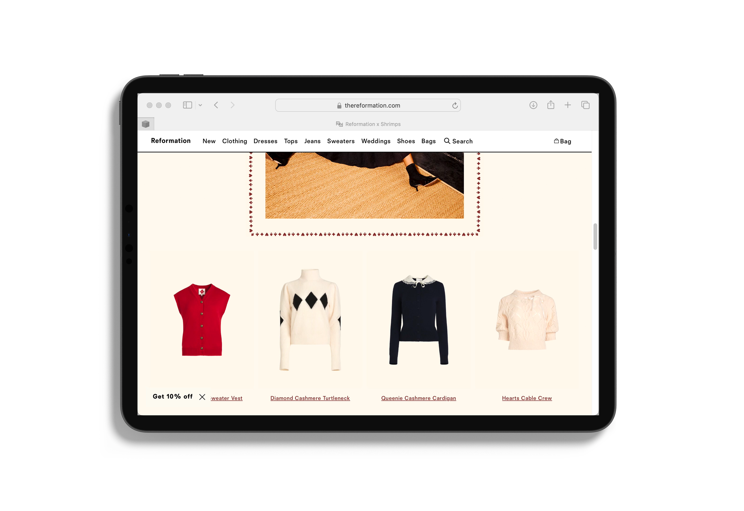For the Holiday ‘24 season, Reformation released their capsule collection with British cult favorite, SHRIMPS, and Jordan and her team created a playful point of view through which customers experienced the launch. Jordan drew on product details and the brand identities of both partners to create an illustrative expression of the collaboration through hand made graphics, spirited animation, and cheeky layouts. This was the first use-case of the custom cursor program Jordan created for Reformation - the success of which permeated throughout all brand collaborations during her time as Associate Creative Director.